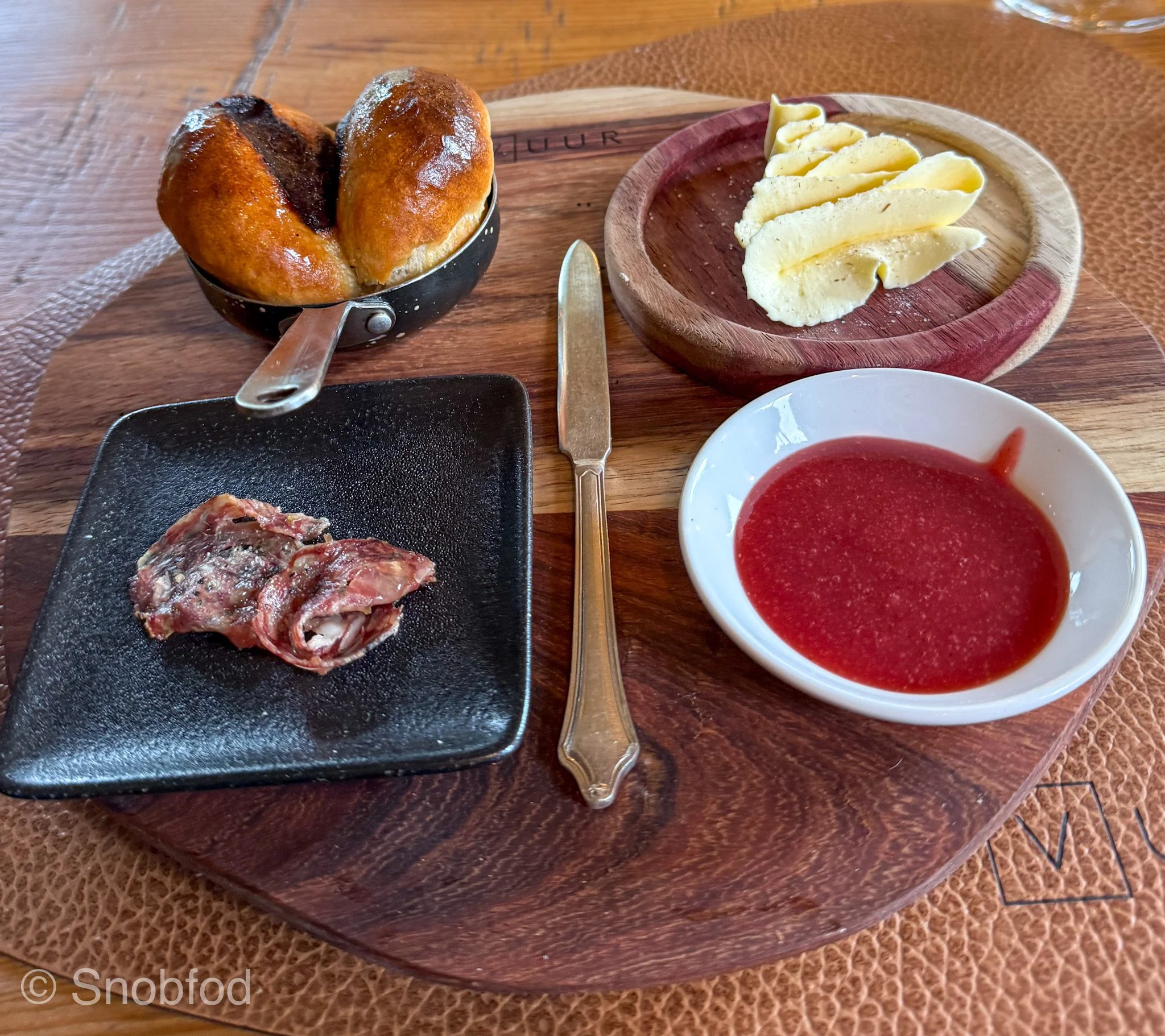 Signature bone marrow sourdough roll, wagyu salami, strawberry jam and butter with rooibos salt