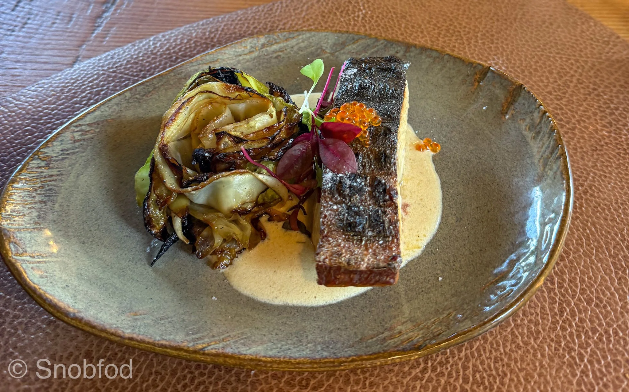Locally caught yellow tail, smoked and grilled, served with charred cabbage