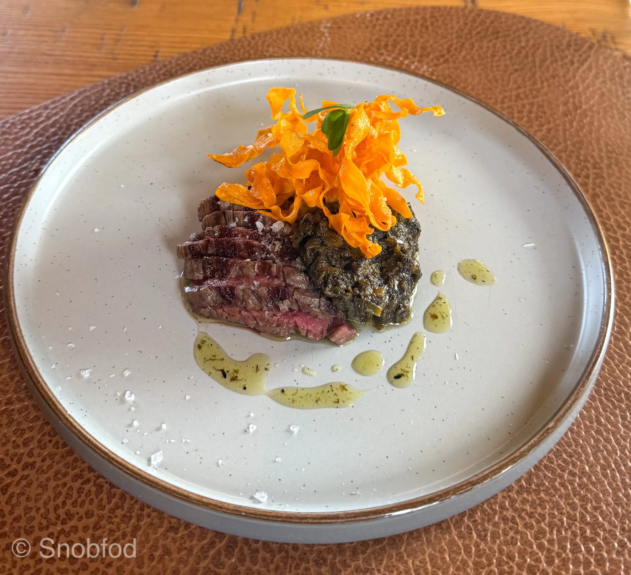 Delicious marbled steak served with sweetpotato ribbons and a wild sorrel chimichurri style sauce